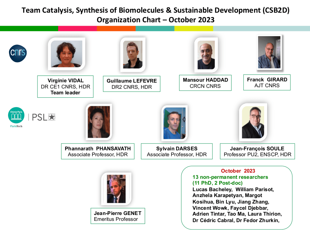 The central theme of the Catalysis, Synthesis of Biomolecules and Sustainable Development Team (CSB2D Team) is the development of new synthetic methods and their application to the synthesis of organic molecules. Research in our group aimed toward the development of novel catalysts, catalytic reactions and methods for organic synthesis. We are interested in using these methods to address problems with a particular focus on synthetic targets of industrial and pharmaceutical interests as well as in the synthesis of molecules having interesting structural and biological properties. As such, the CSB2D Team has a recognized expertise in the design of novel organometallic catalysts and in the fields of transition-metal catalysis (asymmetric reductions, cycloadditions, cascade reactions, non-noble metal catalysis, photoredox catalysis applied to C-H functionalization) The CSB2D Team has a strong interest in the development of new methods applied in the context of industrial partnerships. A focus on mechanistic studies and reactivity analysis is also performed in the Team, in order to build a bridge between fundamental investigations and applications in organometallic catalysis. Innovative synthetic methodologies (e.g. continuous flow and ball-milling reactors) are also developed in the CSB2D Team.